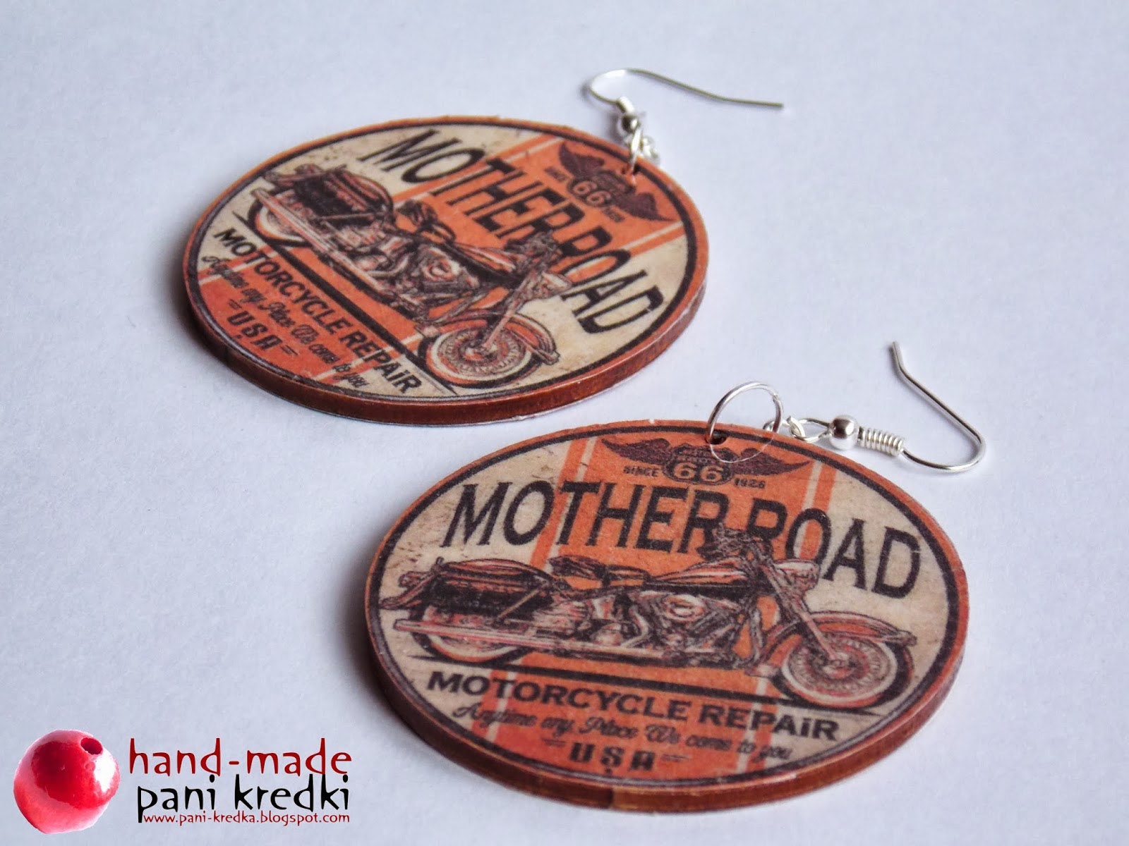 Kolczyki wykonane metodą decoupage z grafiką nawiązującą do słynnej amerykańskiej trasy 66, tak zwanej drogi matki. Całkowita długość kolczyka razem z biglem to około 7 cm.